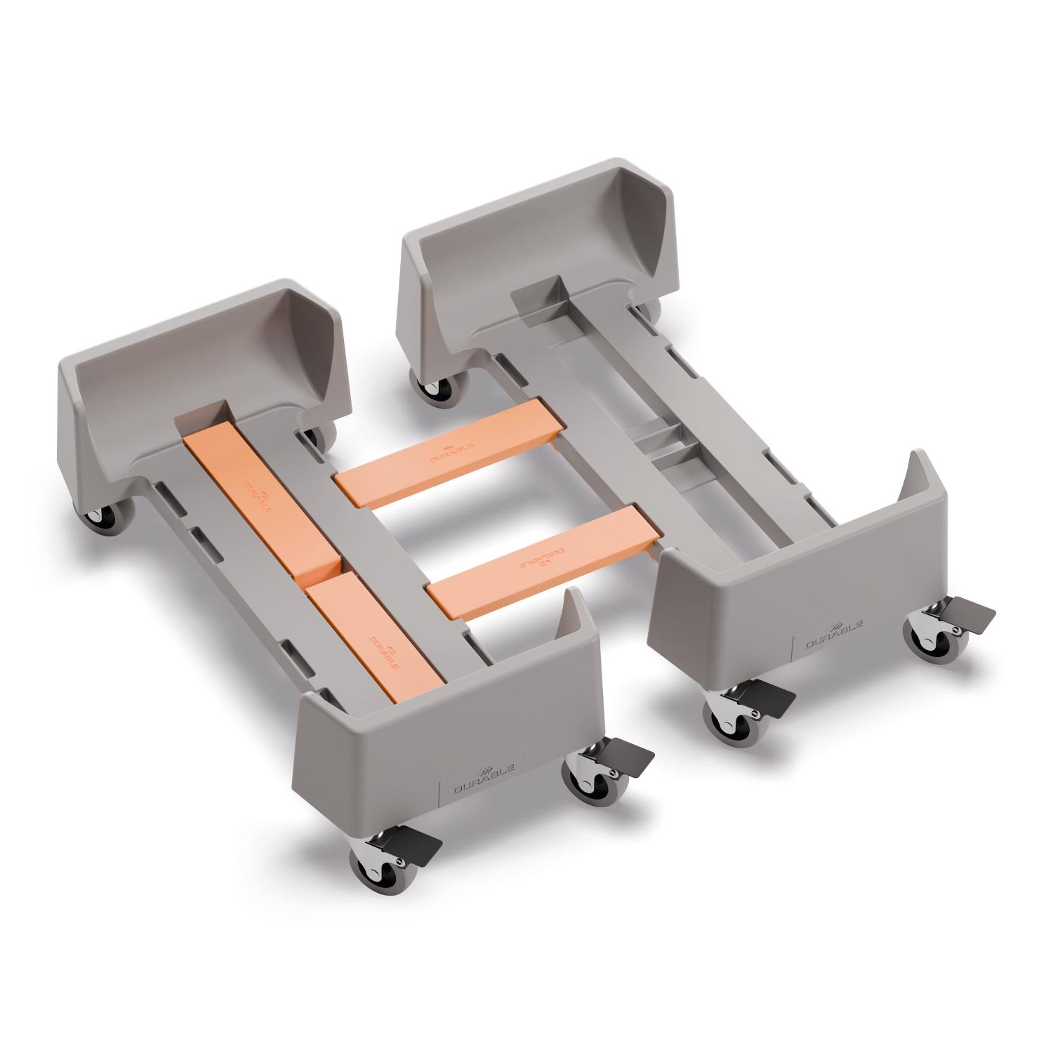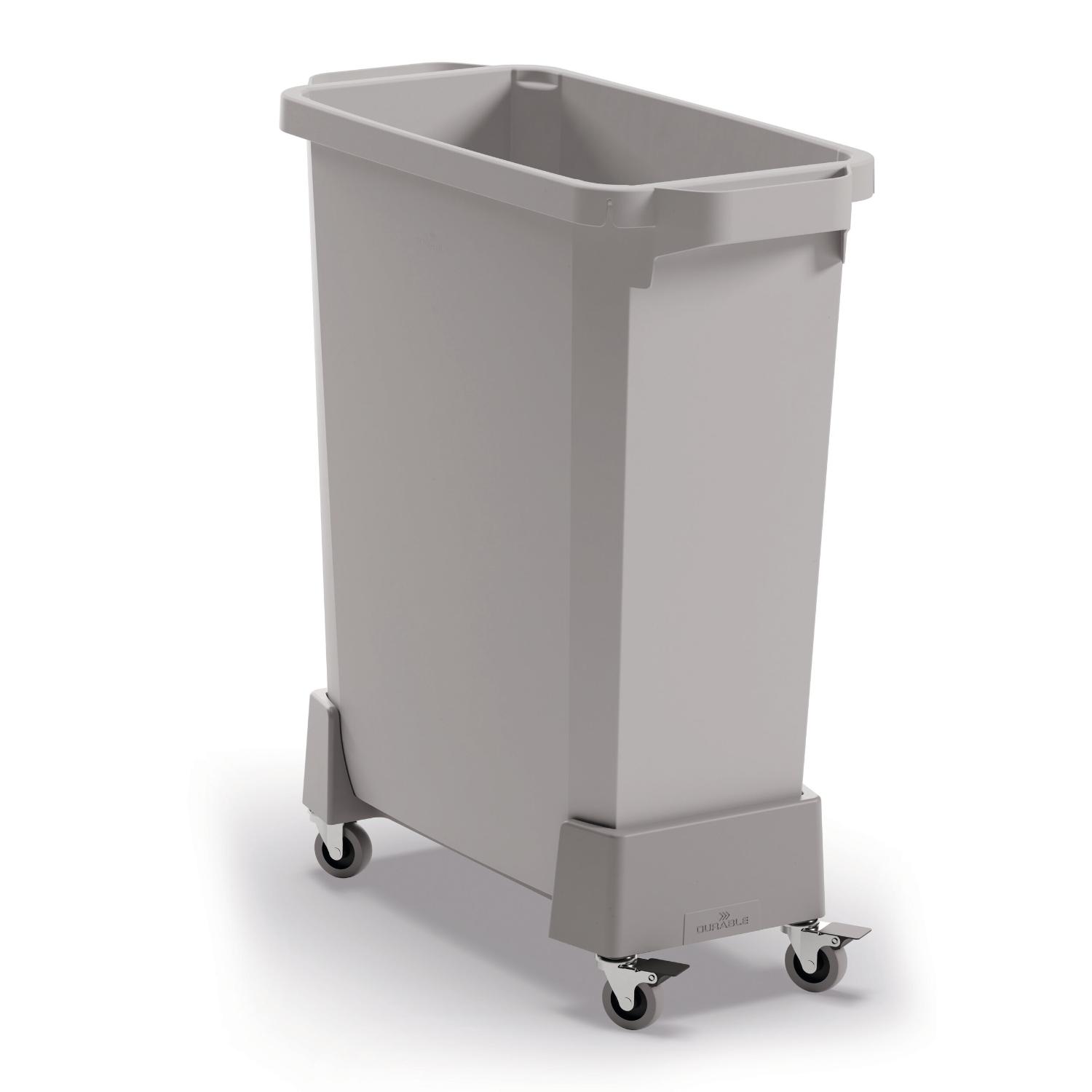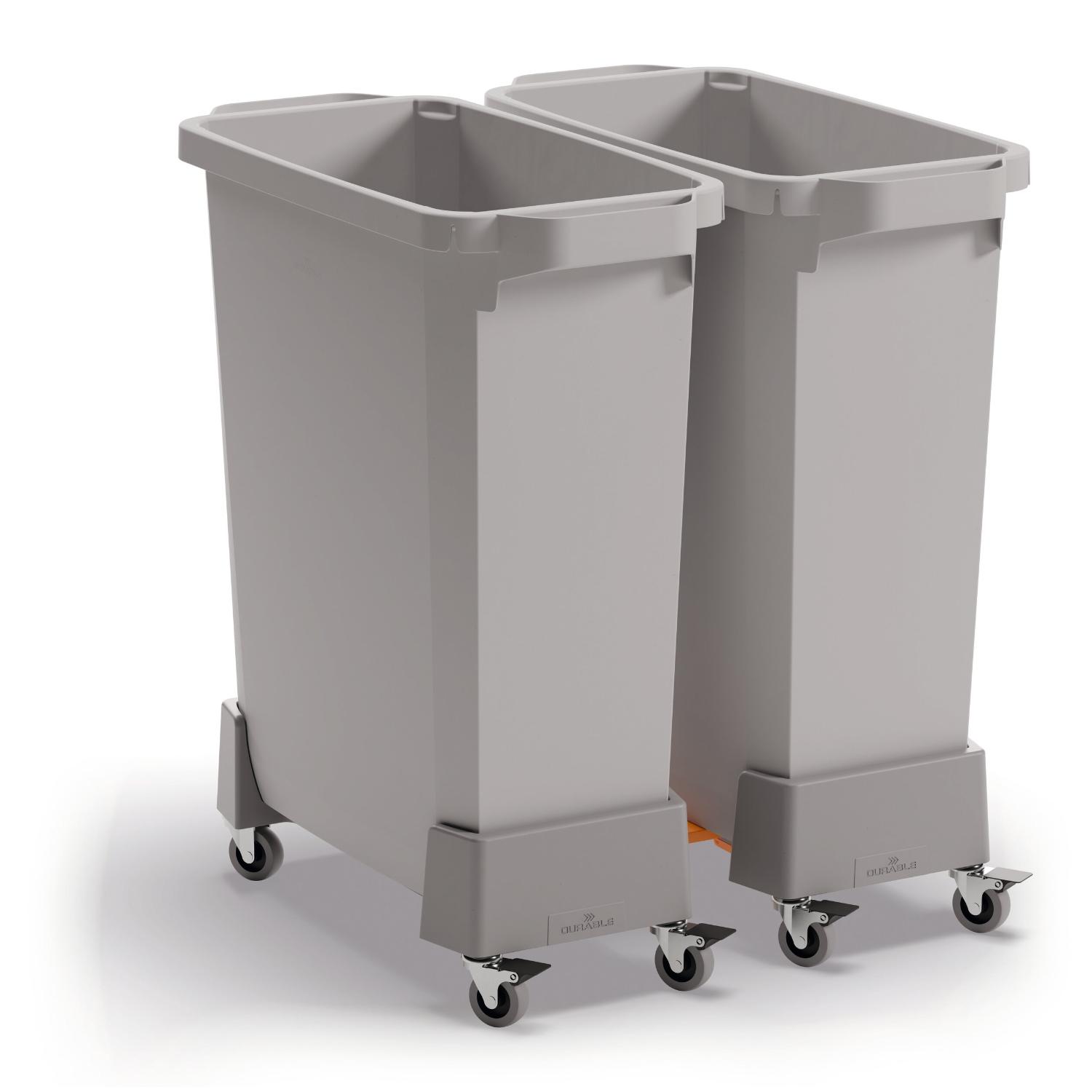 DURABIN 60 rPP affaldsvognen gør det nemt at flytte en fyldt DURABIN 60 liter-spand på en praktisk måde. For eksempel råmaterialer, materialer, der skal genbruges, eller madaffald, der skal indsamles et andet sted. Til indendørs og beskyttet udendørs brug på jævne overflader i lagerbygninger, produktionsområder, kantiner osv. Op til 4 vogne – til både 60- og 90-liters spande – kan forbindes ved hjælp af de medfølgende og integrerede koblinger. Selve bundpladen er lavet af 100 % genanvendt polypropylenplast, hvilket betyder, at produktet inklusive hjul er lavet af 50 % genanvendt materiale. Det er i tråd med DURABLEs bæredygtighedsstrategi RETHINK, som fokuserer på at minimere miljøpåvirkningen ved at designe produkter, der er funktionelle og holdbare, og som er fremstillet med omtanke for ressourcer og genbrug. Fugtbestandig, hvilket gør den lettere at rengøre. Hjulene har en diameter på 50 mm, og to af dem har bremser. Kan belastes med op til 80 kg Mål inkl. hjul: 240 x 165 x 495 mm (BxHxD)