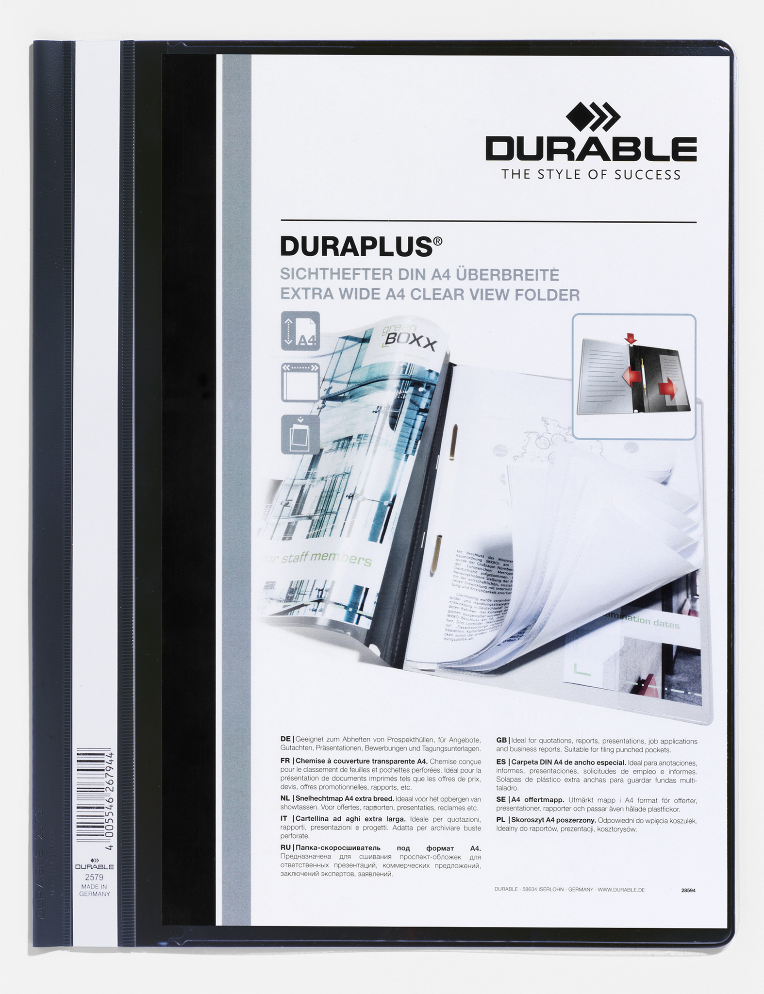 Tilbudsmappe A4 overstørrelse format der kan indeholde faneblade, registre eller hullede plastlommer. Farvet bagside og klar dobbelt forside til indstik af f.eks. brochureblad. Med split, overligger og etiketstrimmel. Transparent vertikal indvendig lomme på bagsiden, til løse dokumenter. Fuld længde dæk skinne til at forbedre udseende og forhindre skader på split mekanisme kan fås, Durable art nr 2924. Kapacitet: ca. 180 ark.