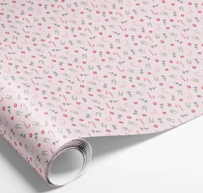 LYSERØD GAVEPAPIR MED JULESTOKKE OG GRENE