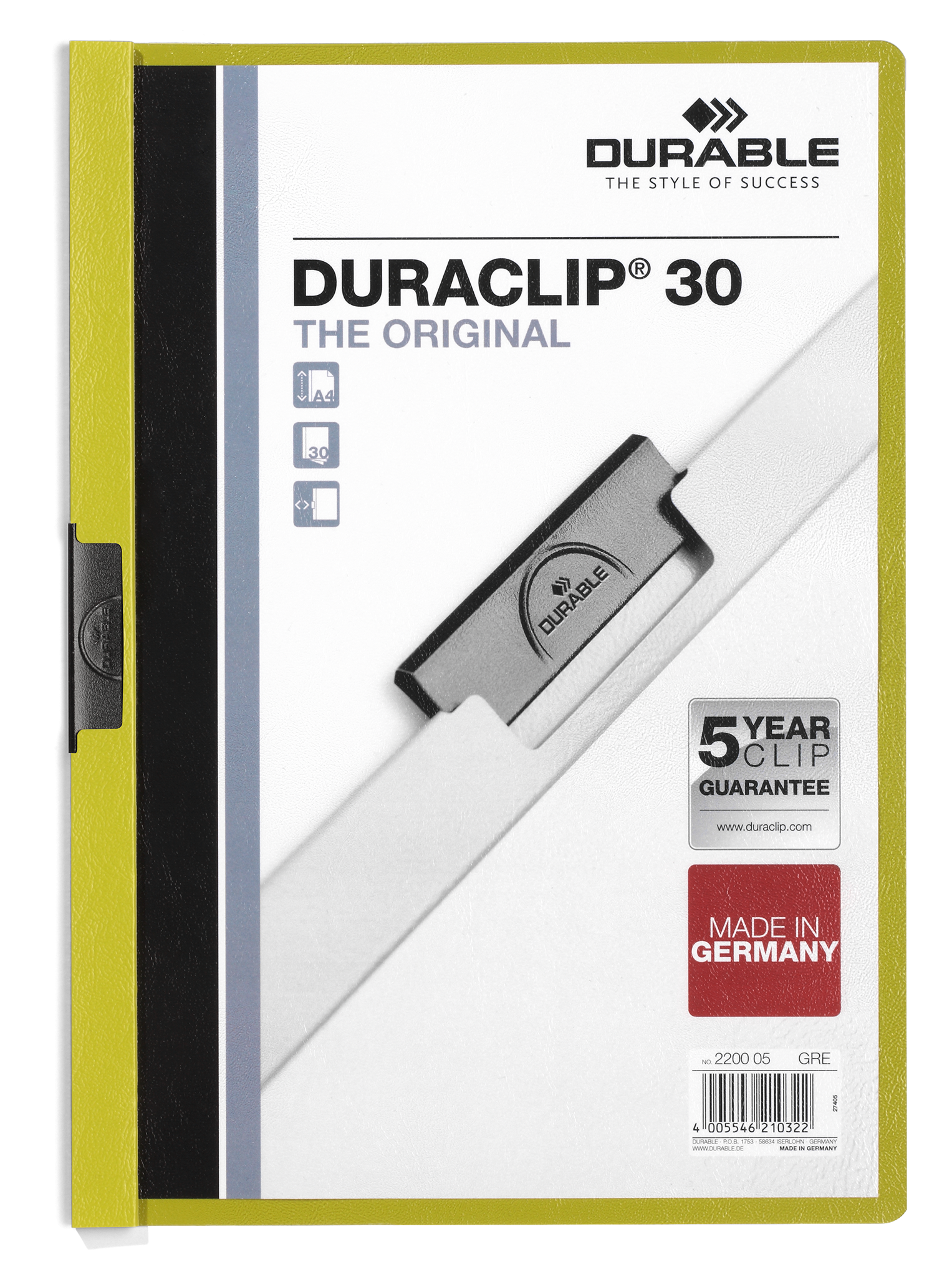 Universalmappen er perfekt til præsentationer, tilbud, rapporter osv. som ikke behøver at blive hullet. Den unikke metalklemme holder dokumenterne på plads. DURACLIP® 30 har en transparent forside og farvet bagside, og kan rumme op til 30 A4 sider. Enkel at anvende: træk klemmen ud, læg dokumenterne i, skyd klemmen tilbage og dokumenterne sidder fast. Den unikke klemme tilpasser sig efter antallet af sider gang efter gang! 5 års garanti på klemmen.https://www.durable.dk/service/durable-garanti/duraclipr-garanti.html