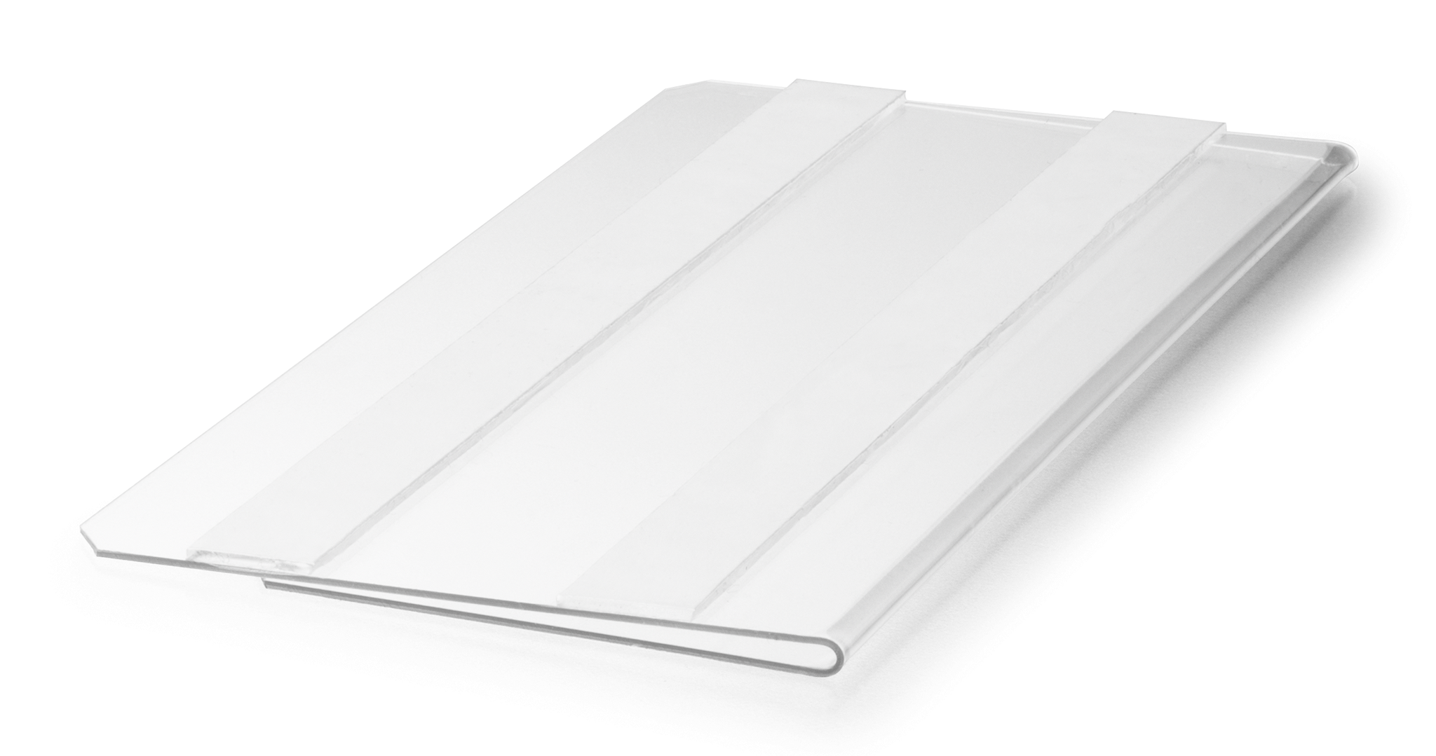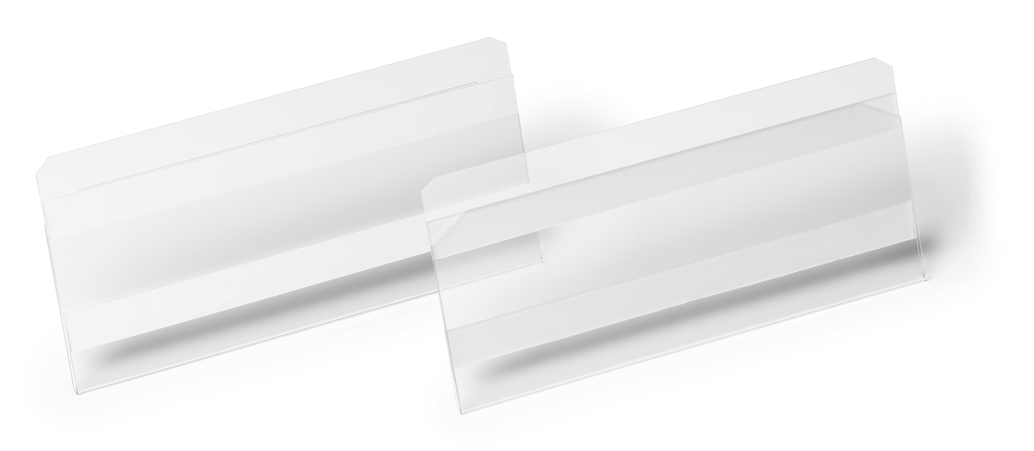Lagerlomme/etiketholder i PET-plast monteret med selvklæbende tapestrimler på bagsiden. Til brug på f.eks. butiks- og lagerreoler.