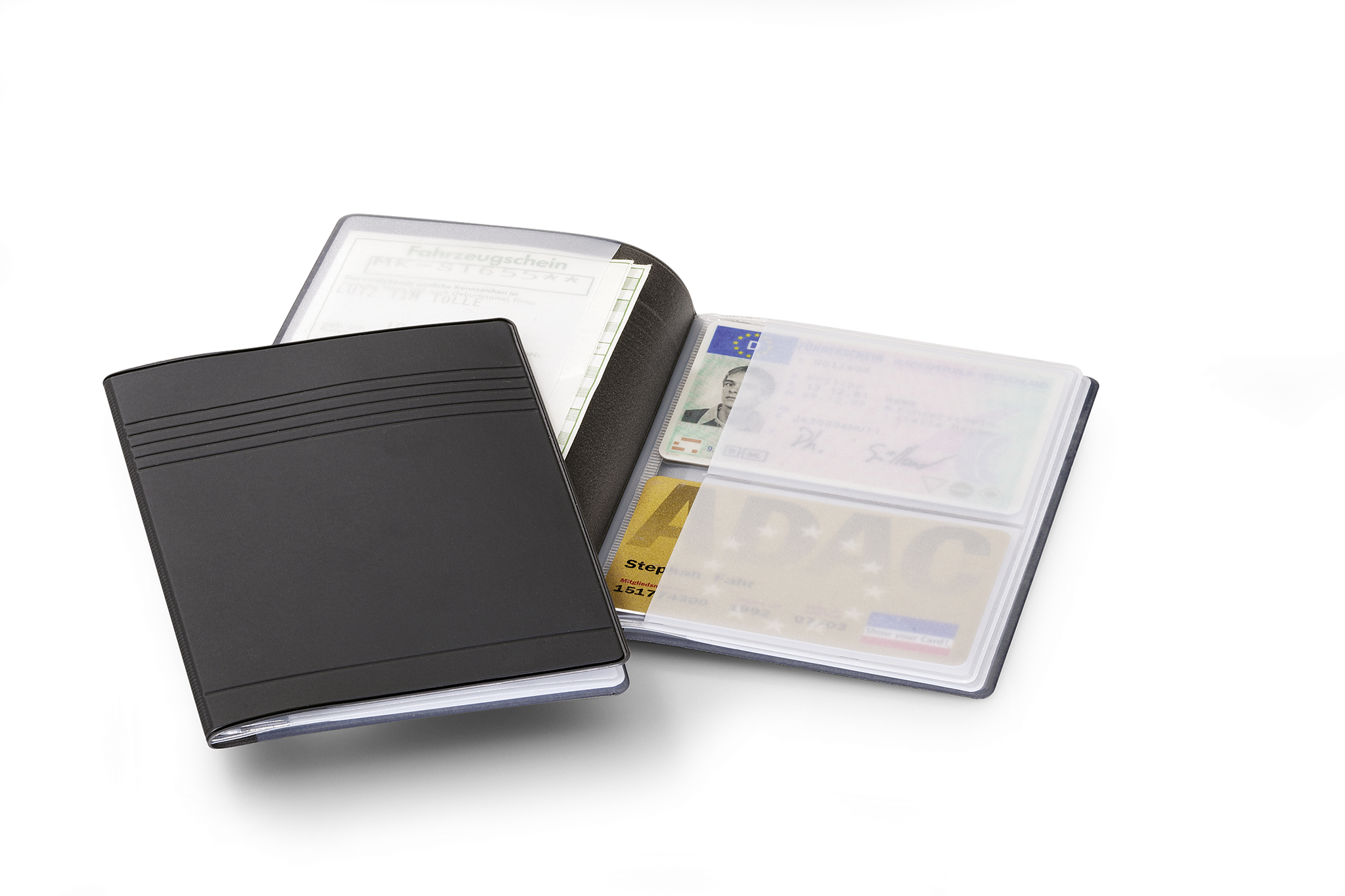 Med svejsede gennemsigtige lommer til 4 kredit-, check- eller medlemskort (54×85 mm) og 4 identitetspapirer (80×115 mm).