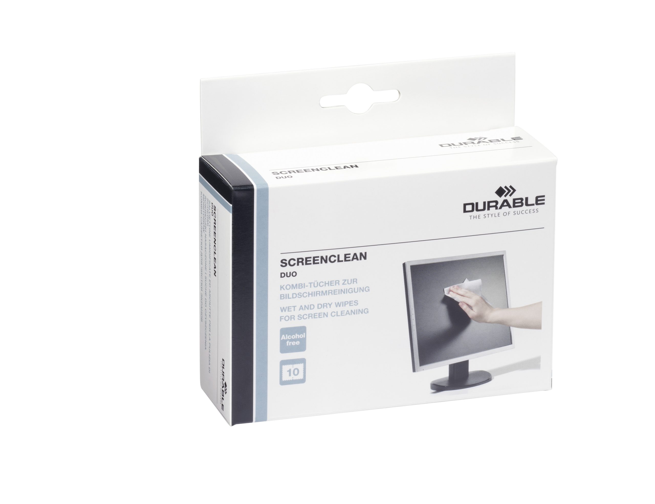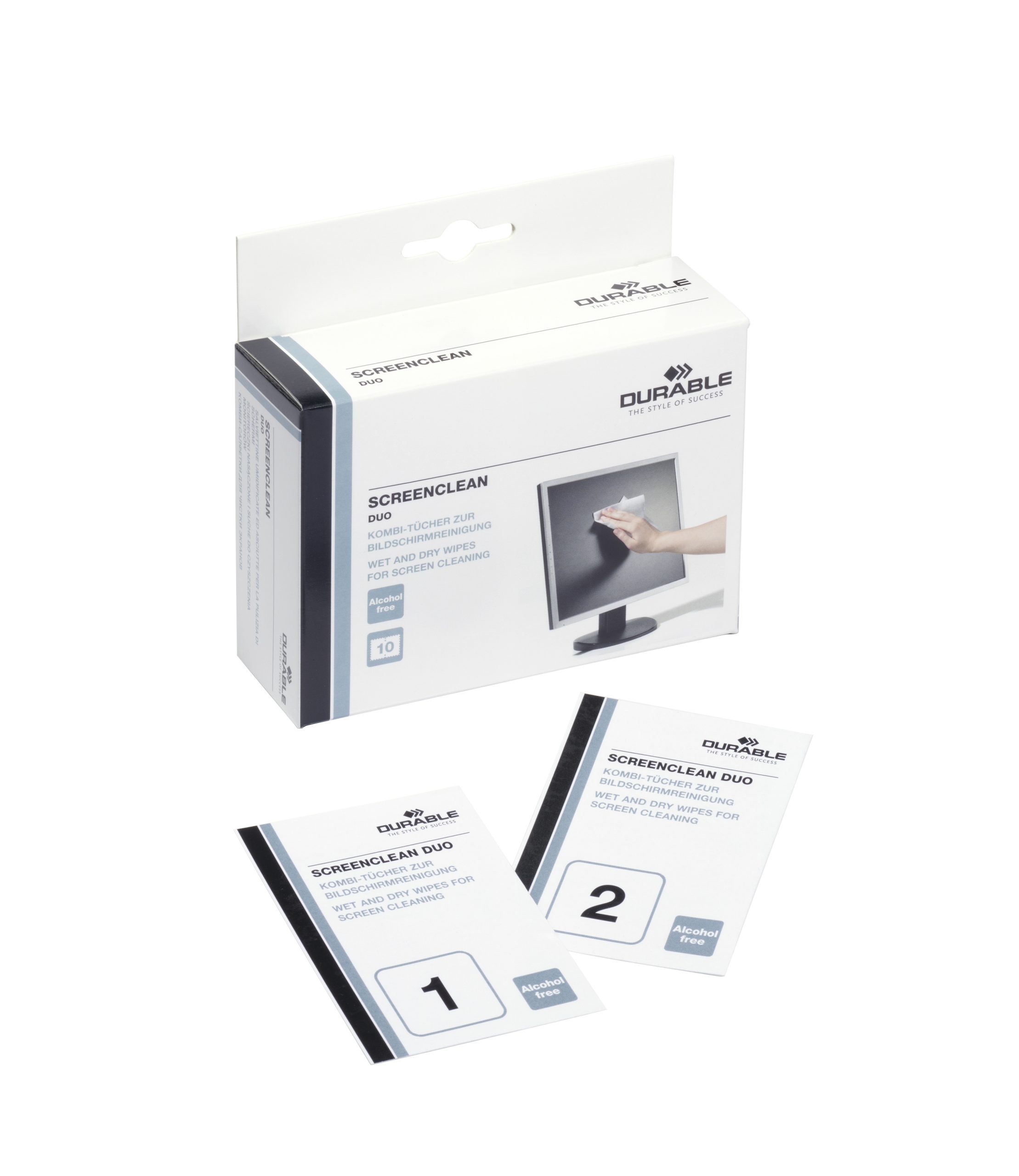 Sæt med individuelt pakket våd og tør renseservietter SCREENCLEAN DUO til rengøring af skærme. 1 æske/10 sæt