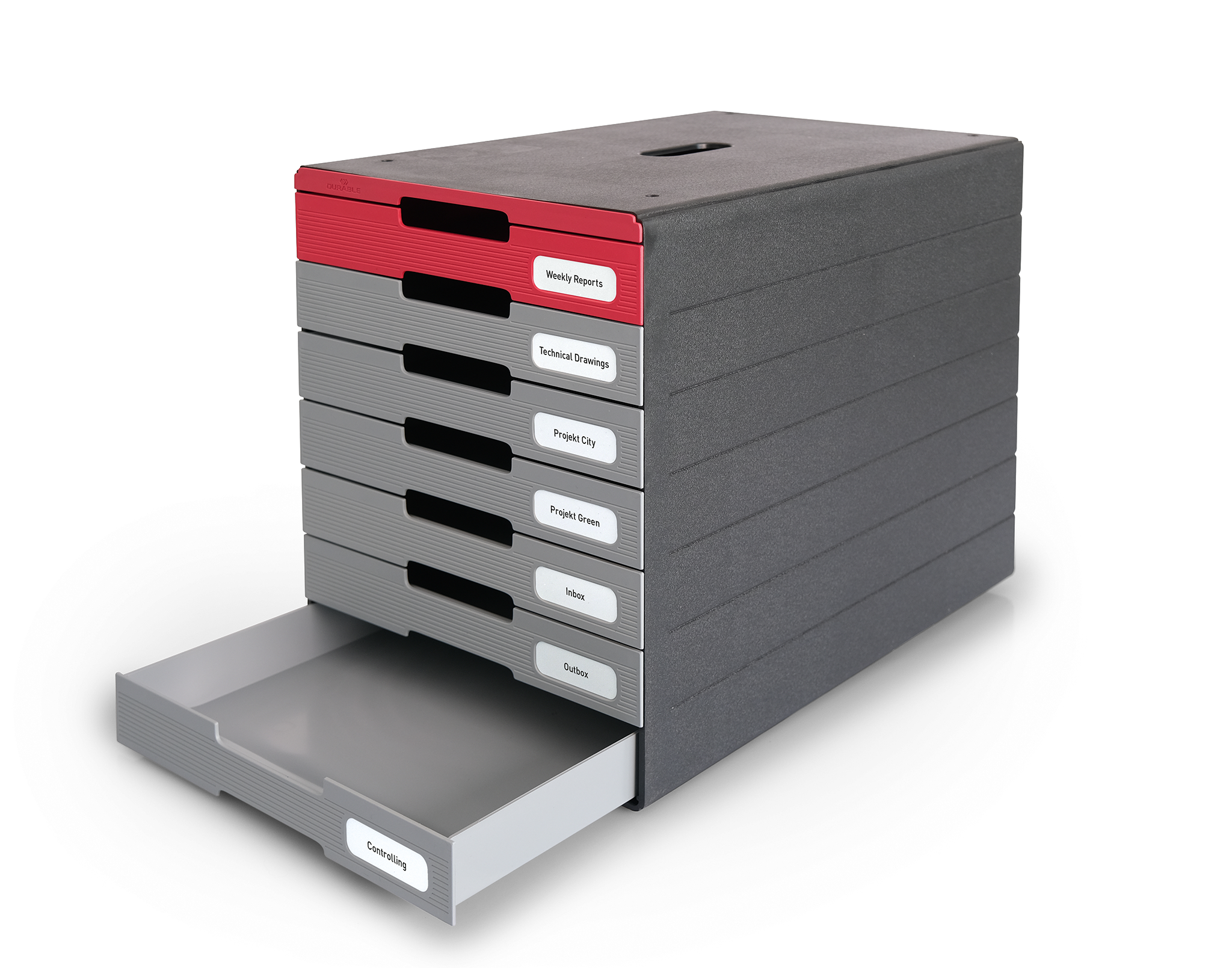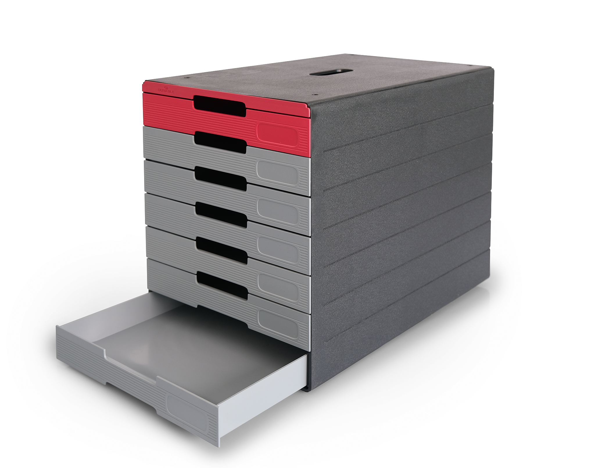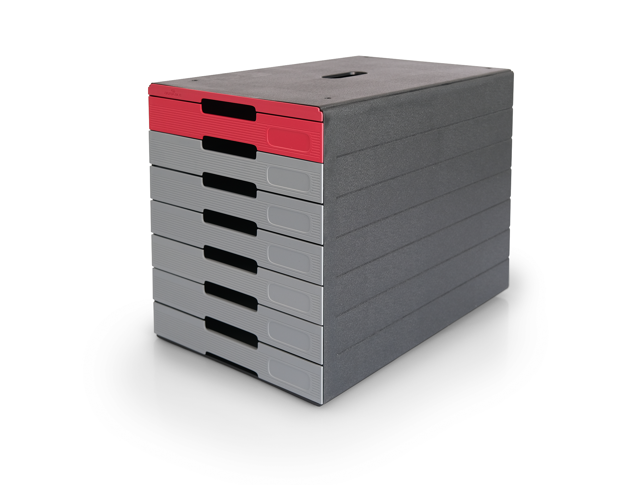 Skuffekabinet med 7 udtrækkelige skuffer, som kan opmærkes med de medfølgende selvklæbende etiket. Blue Angel-certificeret.